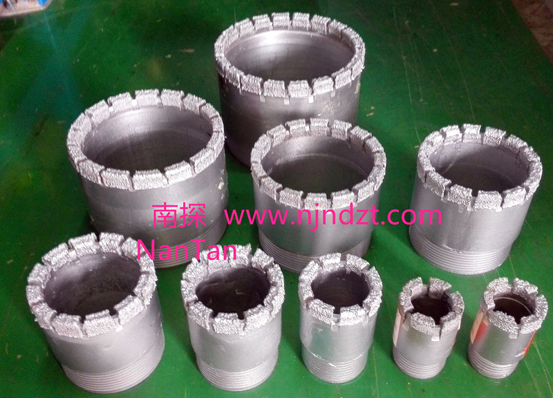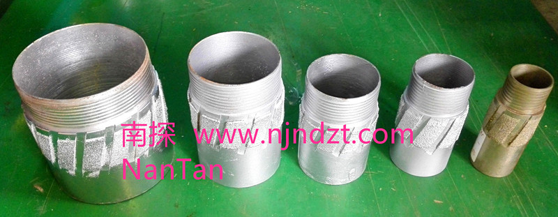 擴(kuò)孔器(電鍍金剛石):是連接在金剛石鉆頭與巖心管之間,起到擴(kuò)大孔徑和修整孔壁保證孔徑不縮小的一種鉆具。由于金剛石鉆頭直徑與巖心管外徑的尺寸相差很小,使孔壁與巖心管之間的間隙更加縮小,使過水受阻,并易造成卡鉆。金剛石擴(kuò)孔器是一短柱狀管體,上下鋼體部分有絲扣分別與鉆頭和巖心管相連,中間部分是覆蓋含金剛石的胎體,其外徑略大于金剛石鉆頭直徑(2毫米左右),胎體側(cè)表面上有過水水槽,使水流通過。在極堅(jiān)硬易磨性的巖層,也有使用兩個(gè)和多個(gè)擴(kuò)孔器,除一個(gè)裝在鉆頭的上部以外,其余的隔地裝在巖心管之間。