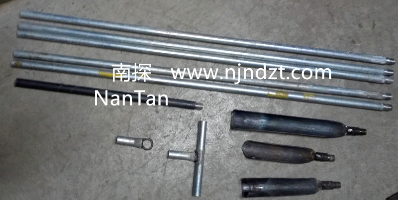 一段有柄,可以接長的白蠟桿。使用時(shí)垂直向下戳擊地面,可深逾20米,利用半圓柱形的鏟可以將地下