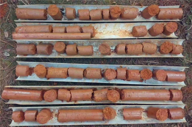 鉆進(jìn)過程中提升和給進(jìn)是依靠手搖卷揚(yáng)裝置配套提引器或加壓手輪通過鏈輪鏈條來完成,大大提高了鉆機(jī)提升和加壓力。鉆進(jìn)過程中,利用泥漿泵冷卻回轉(zhuǎn)器和鉆頭,并攜帶土巖屑返回地表。隨著鉆具向地下延伸,所需要的土巖樣不斷進(jìn)入到巖心管內(nèi),當(dāng)土巖樣達(dá)到預(yù)定深度后,便可以將鉆桿取出,實(shí)現(xiàn)了單回次取樣作業(yè)。重復(fù)以上步驟,直至全孔取樣完成。