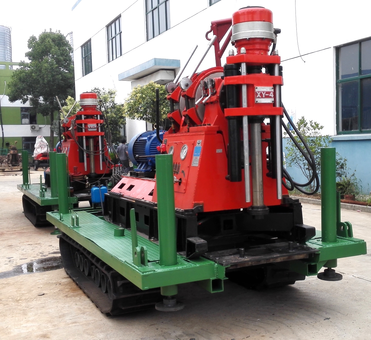該總成裝有大型聯(lián)合收割機(jī)橡膠履帶行走機(jī)構(gòu)和行走操縱系統(tǒng),配套柴油機(jī)、鉆機(jī)橫梁、4組大液壓油缸調(diào)平衡支撐腿、工作平臺(tái)和鉆塔系統(tǒng)(2組主塔腿、2組付塔腿、起落塔裝置、雙滑輪天車、多組主付腿橫拉支撐)組成。該系列產(chǎn)品行走平穩(wěn),轉(zhuǎn)向靈活,采用幾型高架底盤,野外通過性能好。