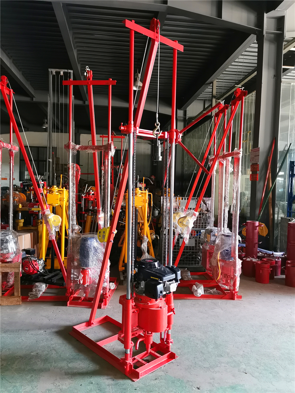 1、取樣鉆機:含汽油發(fā)動機鉆進裝置、鏈條式支架、轉(zhuǎn)向盤、木架底座。